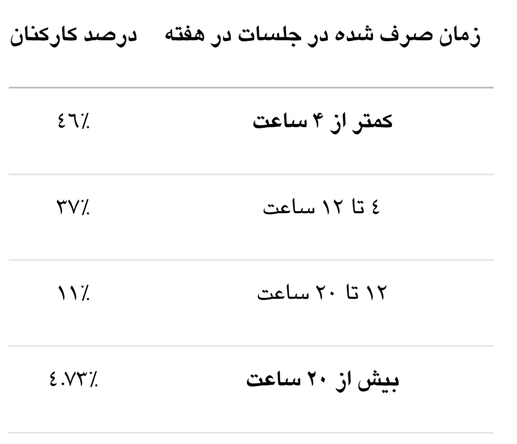 در ادامه آمار بیشتری ارائه میشود که بر میزان وقت تلفشده در جلسهها تأکید میکند: