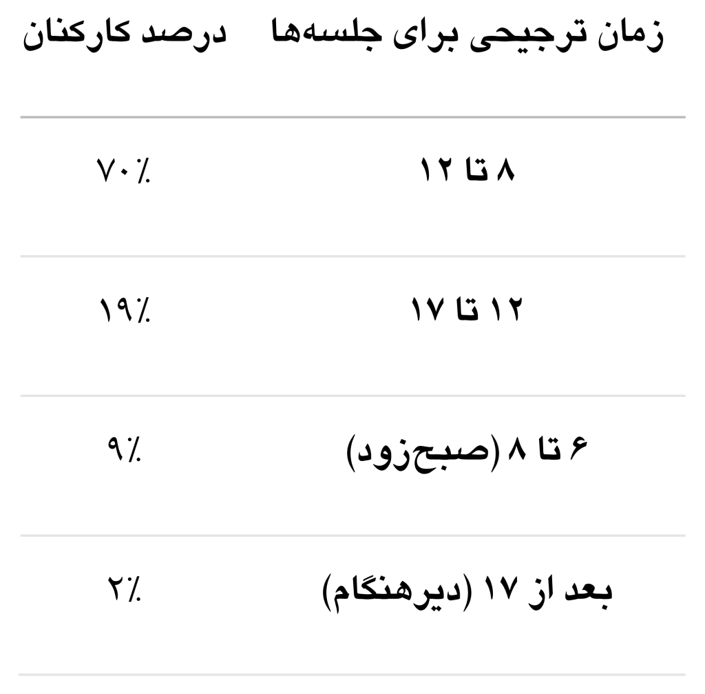 - جلسههایی که در بعدازظهرها برنامهریزی میشوند، معمولاً کمبازدهتر از جلسههایی هستند که برای صبح برنامهریزی شدهاند.