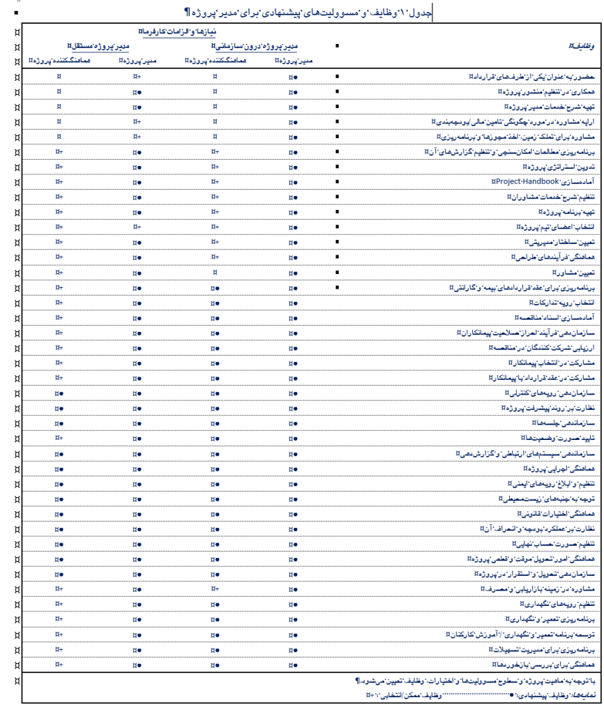 با توجه به سطح مهارتها و نيازهاي کارفرما، ماهيت پروژه، برنامه زماني قراردادها و مولفههاي مشابه وظايف مدير پروژه ميتواند متغيير باشد. در صورتي که کارفرما فاقد مهارتهاي لازم در صنعت ساخت باشد، ممکن است مدير پروژه خود نسبت به تدوين و تنظيم شرح وظايفش[6] اقدام کند. هر چند وظايف اختصاصي مدير پروژه با توجه به مرحلهاي از چرخه عمر[7] كه پروژه در آن قرار دارد، تغيير ميكند؛ اما كنترل زمان، هزينه و كارايي پروژه، بخش مستمر از وظايف مدير پروژه است. اين كنترلها از طريق مورد توجه قرار دادن شرايط آتي پروژه و فراهم ساختن اطلاعات مفيد (مباني تصميمگيري)، براي مدير پروژه و كارفرما، انجام ميشود. ماتريس وظايف پيشنهادي براي مدير پروژه و نيازها و الزامات كارفرما در جدول 1 ارايه شدهاست. ضروري است این موارد متناسب با اهداف كارفرما، ماهيت پروژه و الزامات قراردادي اين فهرست اصلاح شود.